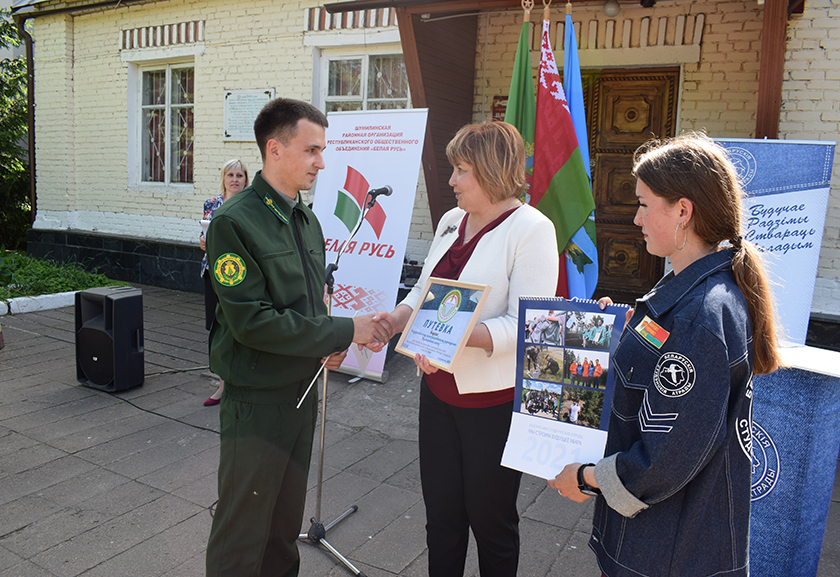 Ірына Шалахава ўручыла пуцёўкі намесніку камандзіра студ-атрада Даніілу Абраменку і прадстаўніку Шумілінскага лясгаса – інжынеру па паляўнічай гаспадарцы маладому спецыялісту Паўлу Цішкевічу.