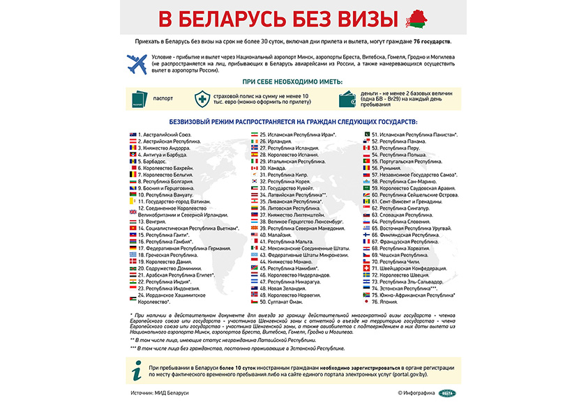 Приехать в Беларусь без визы на срок не более 30 суток, включая дни прилета и вылета, могут граждане 76 государств.