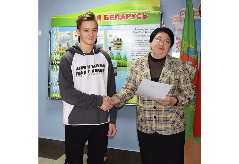 Начальнік аддзела па адукацыі райвыканкама Валянціна Мянькова, якая прысутнічала на лінейцы, уручыла таленавітай дзесяцікласніцы Пасведчанне аб узнагароджанні яе прэміяй Спецыяльнага фонду Прэзідэнта Рэспублікі Беларусь па сацыяльнай падтрымцы адораных навучэнцаў і студэнтаў.