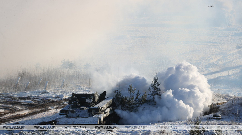 На участке местности Барановичи подразделения механизированной бригады ВС Беларуси и подразделения морской пехоты ВС РФ при поддержке авиации ведут учебные боевые действия на рубежах маневренной обороны, обеспечивая выход из учебного боя 1-го эшелона.