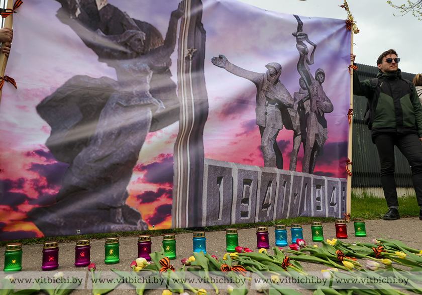 Молодые люди развернули возле Латвийского Консульства изображение монумента. Поместили рядом лампады памяти и живые цветы. К акции присоединились активисты Белорусского общественного объединения ветеранов, бывшие малолетние узники. Солидарность проявили и представители трудового коллектива РУП «Витебскэнерго», а также многочисленные прохожие.