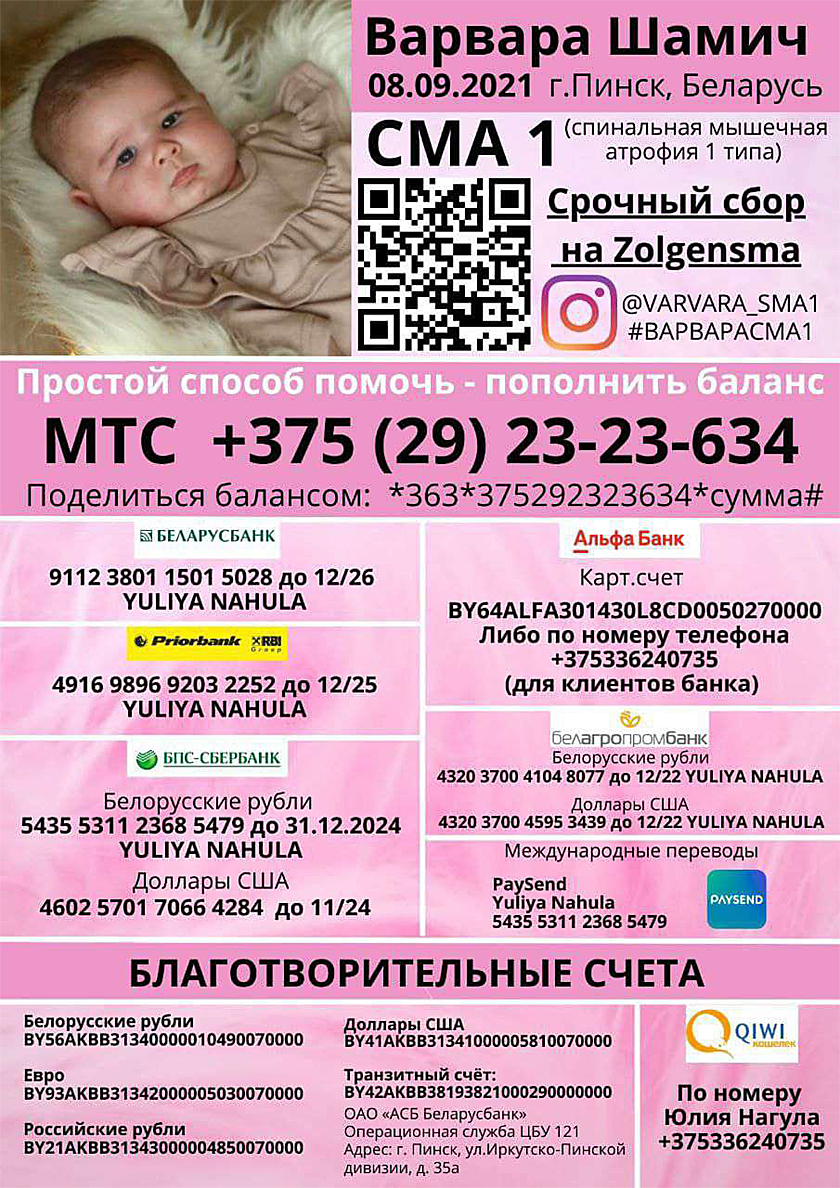 С огромной просьбой о помощи, к Вам обращаются родители Шамич Варвары — Юлия и Андрей. Мы, Юлия Нагула и Андрей Шамич – родители маленькой Варвары. Она родилась 8 сентября 2021г.
