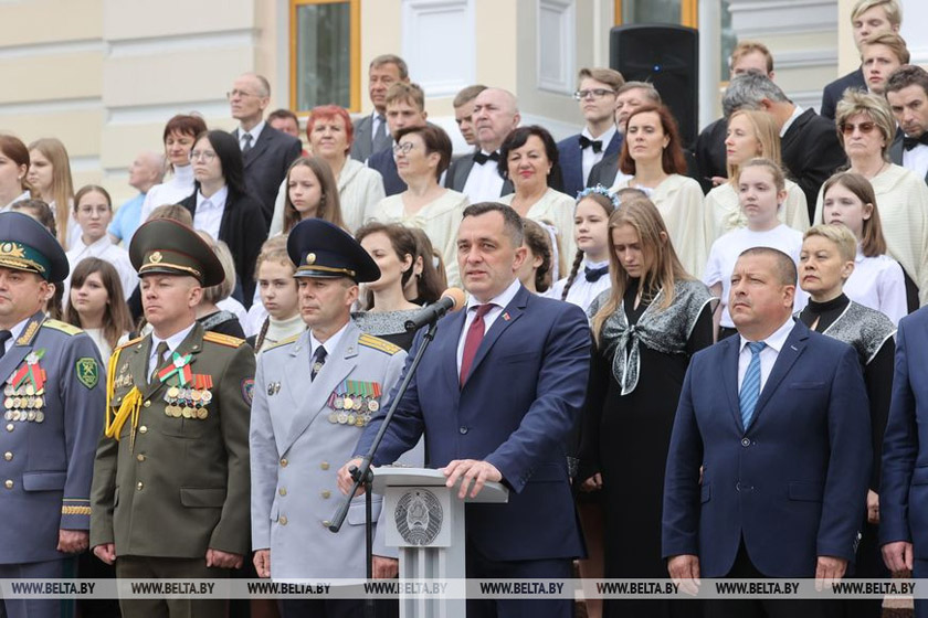 Он добавил, что путь к обретению государственности, который выпал на долю белорусов, был сложным и тернистым. Только в ХХ веке они получили шанс на самоопределение. На референдуме в 1995 году белорусы выбрали нынешние флаг, герб и гимн, отражающие неразрывную связь исторического и современного этапов становления страны. Под этим флагом Беларусь более четверти века динамично развивается и утверждает себя на международной арене. Он озаряет спортивные победы, реет на высочайших вершинах и полюсах планеты, представляет нашу страну в других государствах, скрепляет национальное согласие и патриотический дух белорусского народа.