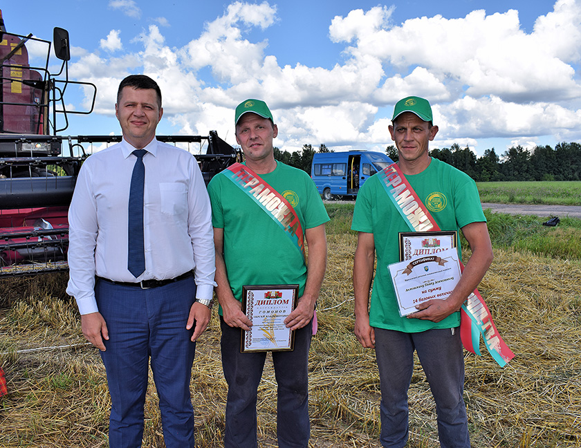 З працоўнай перамогай павіншавалі экіпаж старшыня райвыканкама Сяргей Галынчык, старшыня камітэта па сельскай гаспадарцы і харчаванні аблвыканкама Сяргей Ягораў, намеснік старшыні абласнога аб’яднання прафсаюзаў Віктар Лугаўцоў.
