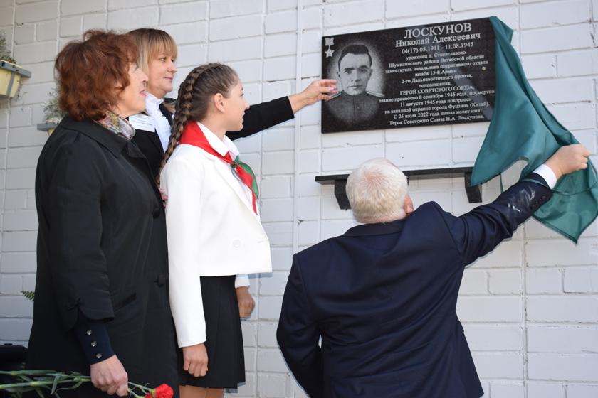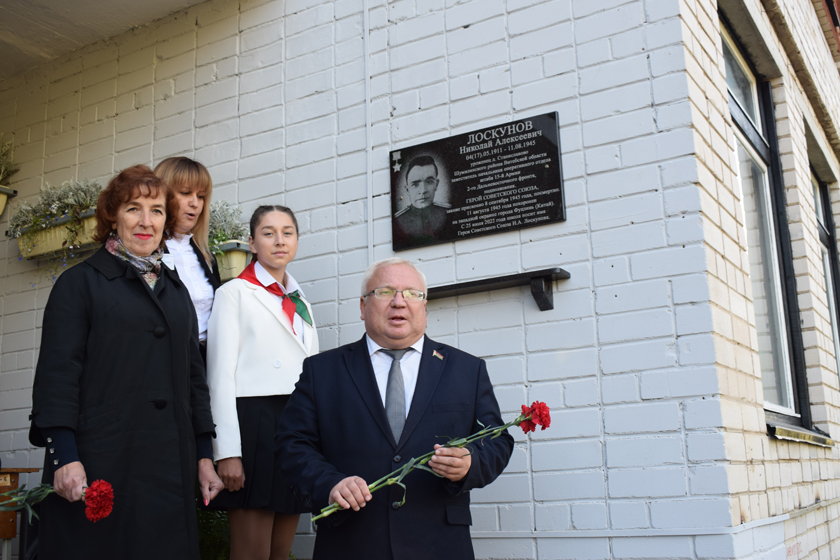 Уладзімір Цярэнцьеў адзначыў, што ў Год гістарычнай памяці асабліва важна тое, як моладзь адносіцца да гераічнага мінулага нашай краіны, шануе подзвіг воінаў Вялікай Айчыннай вайны, ведае пра ўклад землякоў у барацьбу з фашызмам. «Ваша школа будзе насіць імя мясцовага ўраджэнца Героя Савецкага Саюза Мікалая Ласкунова, які сваім жыццём заплаціў за тое, каб мы жылі пад мірным небам. Ужо пасля Вялікай Перамогі над фашызмам, у вайне з Японіяй ён здзейсніў сапраўдны подзвіг, бо тыя загады і данясенні, што ён перадаў камандаванню, змаглі ўратаваць жыцці тысяч савецкіх воінаў, якія наступалі на японскія ўмацаванні. Герой пахаваны ў далёкім кітайскім горадзе Фуцзянь, але мемарыяльная дошка, якую мы адкрываем сёння на будынку школы будзе нагадваць сённяшнім і будучым вучням школы пра Мікалая Ласкунова. Гэтая эстафета пакаленняў захавае памяць пра подзвіг героя», – сказаў кіраўнік дэпутацкага корпусу Віцебшчыны.