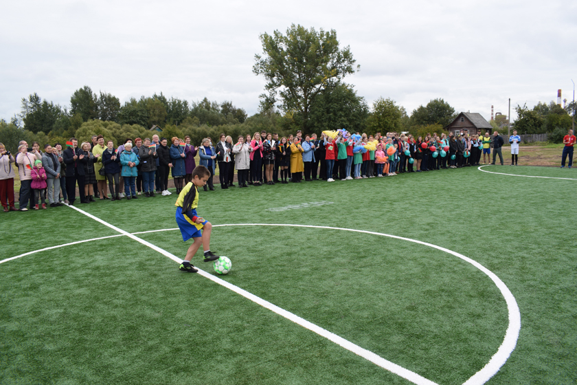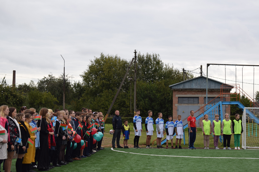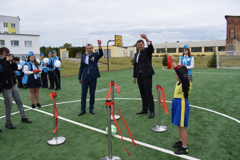 Права перарэзаць чырвоную стужку даецца кіраўніку раёна Сяргею Галынчыку, в. а. старшыні Обальскага сельвыканкама Сяргею Мураўёву, дырэктару школы Аляксандру Сачыўку і вучню школы – прызёру рэспубліканскіх спаборніцтваў «Скураны мяч» Назару Фандарэнку, які, дарэчы, забіў першы гол у вароты новай пляцоўкі.