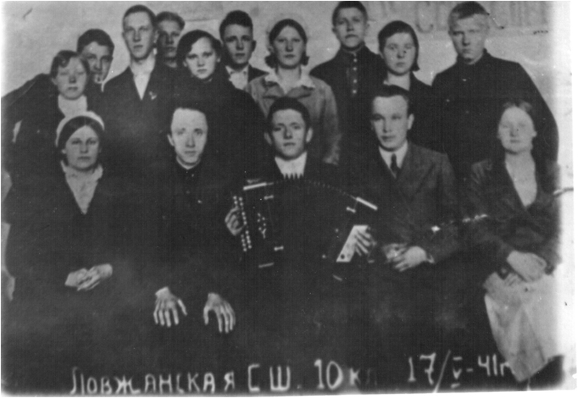 С первых дней Великой Отечественной войны жители Ловжи и окрестных деревень начали борьбу с оккупантами. Большая часть выпускников Ловжанской школы первого, 1941 года выпуска ушла добровольцами на фронт, многие участвовали в партизанском движении со своими учителями. Среди них Афанасьев Иван Дмитриевич, учитель физики, с 3 августа 1942 года партизан отряда им. К.Е. Ворошилова бригады им. С.М. Короткина. Погиб в 1943 году. Крицкий Фёдор Орестович, учитель истории, организатор подполья, расстрелян фашистами на торфозаводе им. Даумана.