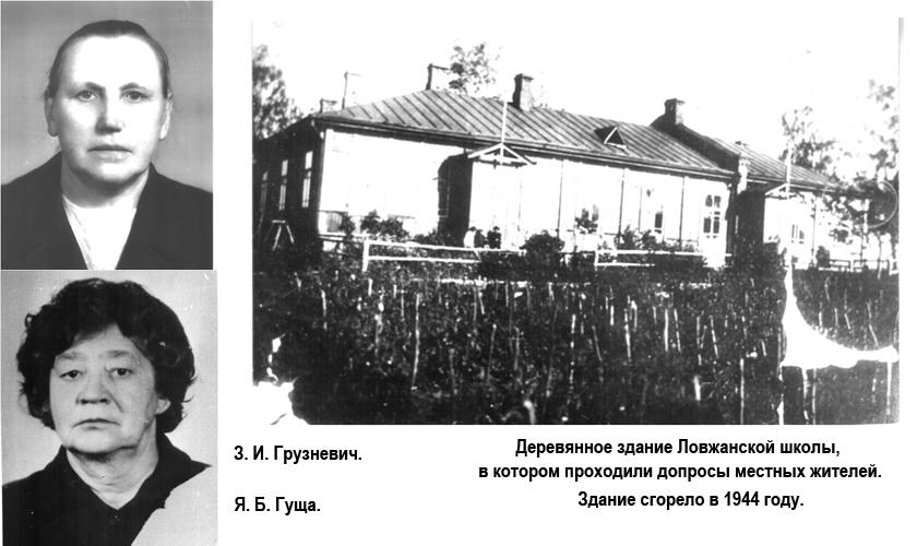Очевидцем событий, происходивших в школе и вокруг нее, в тот трагический день была Ушакова Лида, ученица 7 класса Ловжанской школы. В школе в большом классе вместе с ловжанцами и населением окрестных деревень находилась и моя мама – Мария Васильевна с малолетними детьми Ниной и Васей. Из уст арестованных сельчан звучали слова презрения и проклятия оккупантам и призыв борьбы с нацистами. Под вечер группу сельчан, примерно 25 человек, повели каратели к яме расстреливать. Большинство жителей оставалось запертой в большом классе. Когда каратели произвели расстрел, нас выпустили из здания школы. На ступеньки школьного крыльца поднялся каратель в черной форме, на голове черная фуражка с большой кокардой и заявил: «из ваших домов все вывезли, ограбили, остались вам пустые стены. Если будете помогать партизанам – останетесь без крова. Если будете на ночь пускать партизан, приедем и сделаем новые ямы, сельчан постреляем, дома сожжем. И вашим партизанам ничего больше не дадите». После этого каратели сели на мотоциклы и с устрашающим ревом уехали. Жители стали расходиться по домам. Некоторые подошли к яме, в которой находились расстрелянные земляки. И я с мамой подошла к яме. Страшно было смотреть на людское месиво окровавленное. Некоторые издавали стоны, а у отдельных людей были судорожные подергивания».