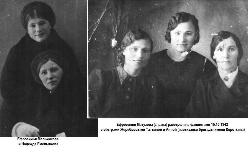 Среди расстрелянных фашистами 15 октября 1942 года и Ефросинья Ивановна Матузова. В партизанской бригаде им. Короткина воевал её сын Леонид, в бригаде им. Ленина – Александр, которые погибли в 1942, 1944 гг. Бывшая колхозница, депутат сельского Совета, тайно пекла хлеб, собирала одежду и обувь для партизан. Ефросинья Ивановна и её сёстры спасли раненого советского лётчика и переправили его в партизанскую зону, а оттуда на фронт. Зверскую расправу фашистские убийцы учинили потом над её матерью Натальей Сергеевной Жеребцовой. Гитлеровцы ее схватили во время воскресной службы в Ловжанской церкви и увезли в деревню Латково. Перед расстрелом ей связали руки колючей проволокой, пытали жестоко и требовали, чтобы она сообщила, где находятся дочери и внуки. Наталья Сергеевна не произнесла ни слова.