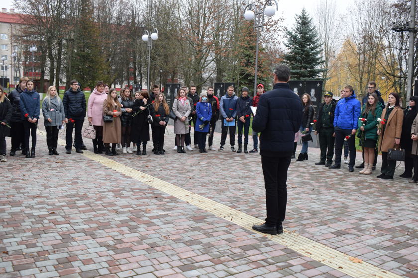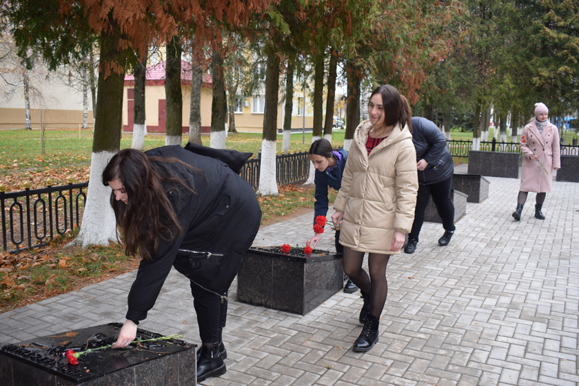 На Алеі Славы ў гарадскім парку райцэнтра – месцы памяці аб гераічных і трагічных старонках гісторыі нашага раёна і ўсёй Беларусі – маладыя людзі ўсклалі кветкі да помніка і мемарыяльных пліт на брацкіх могілках.