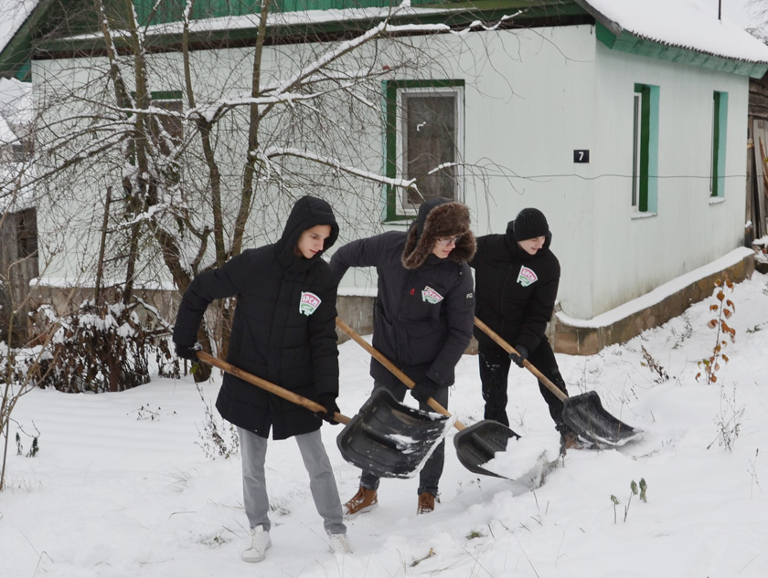 А валанцёры пярвічкі БРСМ Шумілінскай СШ №1 Віктар Чарвякоў, Аляксей Масько і Яўген Данчанка на чале з галоўным спецыялістам райкама БРСМ Лізаветай Юшчанка расчысцілі ад снегу падворак адзінока пражываючага жыхара Шуміліна з абмежаванымі магчымасцямі.