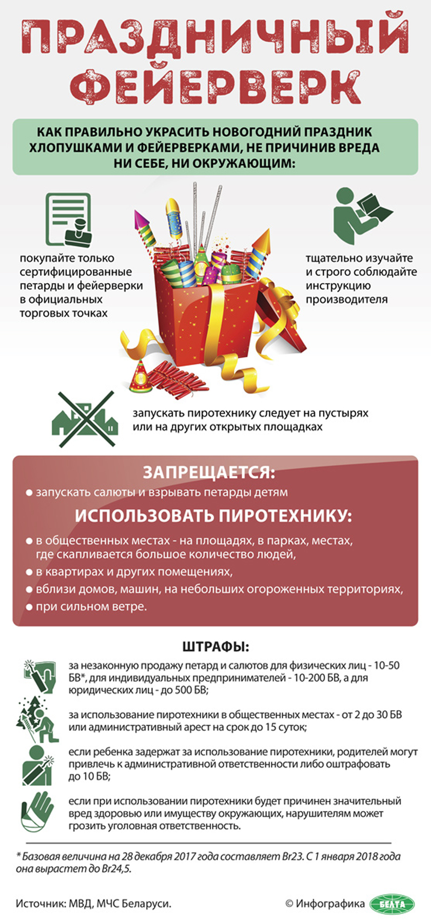 «Узрываць піратэхніку можна толькі ў бязлюдных месцах. Катэгарычна забараняецца рабіць гэта ў грамадскіх месцах, закідваць на балконы і ў вокны, – расказаў намеснік начальніка РАУС Аляксандр Шумінскі. – У выпадку, калі піратэхніка парушае спакой грамадзян, дзеянні могуць класіфікавацца як дробнае хуліганства, за якое прадугледжана адміністрацыйная адказнасць (штраф ад 2 да 30 БВ або адміністрацыйны арышт). Разам з тым у выпадку прычынення значнай шкоды здароўю або маёмасці людзей, віноўнік будзе прыцягнуты да крымінальнай адказнасці (згодна з арт. 299 Крымінальнага кодэкса прадугледжана адказнасць у выглядзе пазбаўлення волі да сямі гадоў). Больш таго, прыйдзецца кампенсаваць маральную і матэрыяльную шкоду».