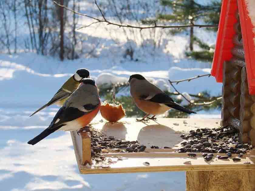 О меню. Даже для зимней бескормицы годится не любой корм. Птицы с удовольствием клюют нежареные (!) семена подсолнечника, тыквы, конопли, ягоды боярышника, шиповника, облепихи, барбариса, калины, пих ты и сосны. Не откажутся пернатые от овса и крошек белого (и только белого!) хлеба, вываренных костей, на которых остались кусочки мяса. Хороша для зимнего прикорма зерновая смесь для попугаев и канареек, в которой есть просо, конопля и канареечное семя. В кормушку можно положить творог средней жирности, смешанный с белыми панировочными сухарями, чтобы не слипался, сваренное вкрутую натертое яйцо, мелко порезанное свежее яблоко. В морозные дни хорошо подвешивать несоленое сало или класть кусочек сливочного масла.