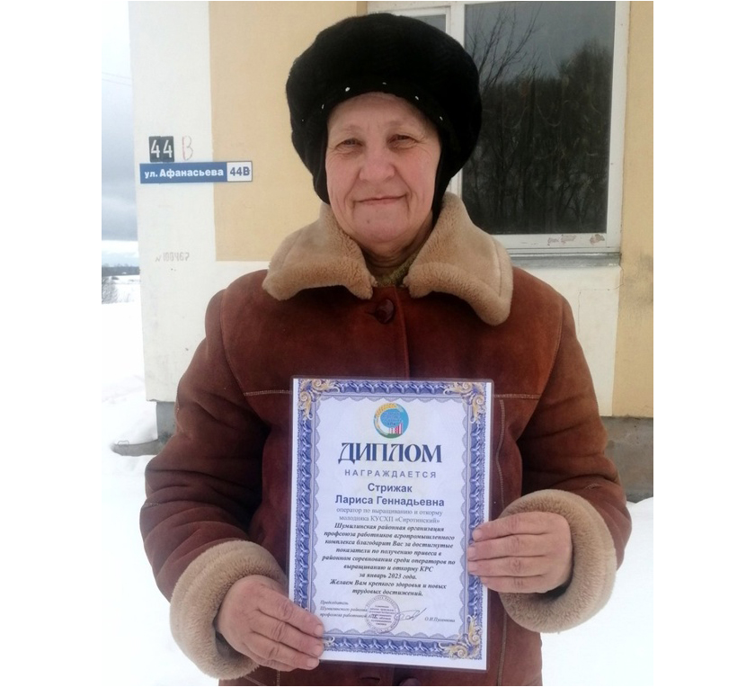 Таму і вынікі ёсць станоўчыя. Па ўмовах раённых прафсаюзных спаборніцтваў за студзень сярод аператараў па доглядзе за маладняком буйной рагатай жывёлы Ларыса Стрыжак заняла прызавое месца. Сярэднясутачныя прывагі цялят у яе групе склалі 542 грамы (плюс 15 грамаў да ўзроўню мінулага года). Дыплом, падарунак і віншаванні за працоўную перамогу Л. Г. Стрыжак атрымала ад старшыні райкама прафсаюза работнікаў АПК Вольгі Пусянковай.