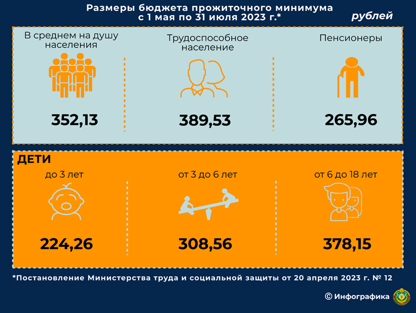 Постановлением Министерства труда и социальной защиты Республики Беларусь от 20 апреля 2023 г. № 12 на период с 1 мая по 31 июля 2023 г. утверждены размеры бюджета прожиточного минимума в среднем на душу населения и по основным социально-демографическим группам.