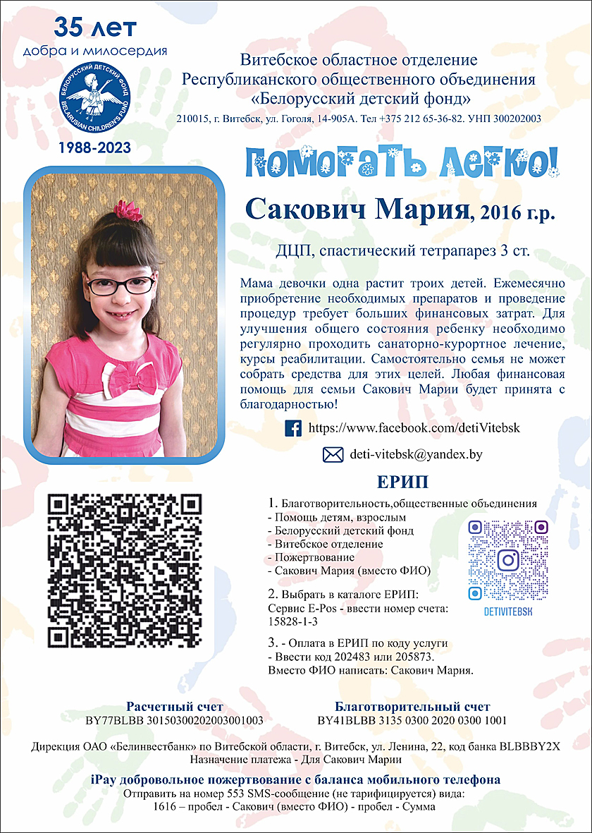 Белорусский детский фонд собирает средства на лечение Марии Сакович