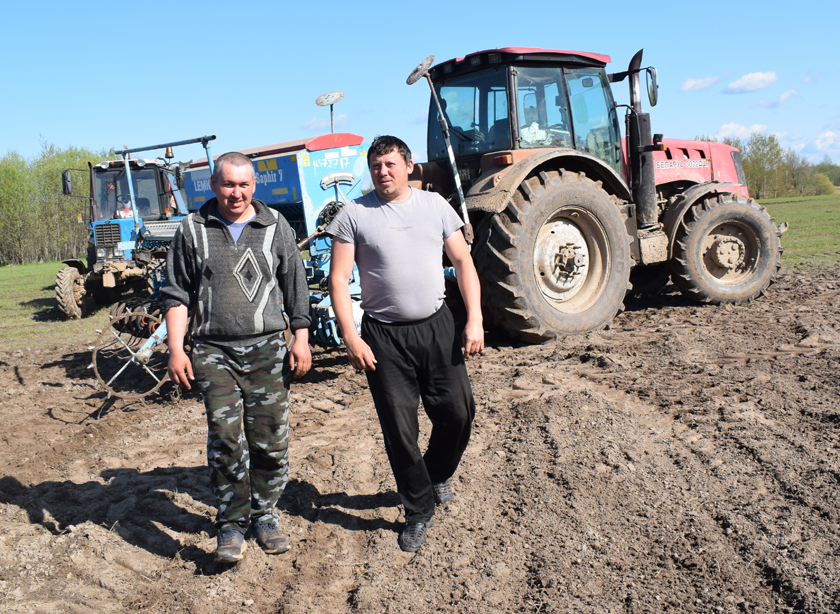 На адным з такіх палеткаў, ва ўрочышчы Слабада, мы і пабывалі нядаўна. На МТЗ з пасяўнымі агрэгатамі тут працавалі Кірыл Калдуноў і Андрэй Аўсянкін. Андрэю — 29 гадоў, Кірылу — 30. Абодва селі за руль трактара практычна адразу пасля заканчэння школы. Вучыліся ў старэйшых таварышаў, а цяпер самі парады могуць даць. Андрэй Аўсянкін з чатырохмятровым пасяўным агрэгатам засявае да дваццаці гектараў за дзень. Кірылу Калдунову даверылі трохмятровы «Лемкен», на якім магчыма справіцца з пятнаццаццю гектарам.