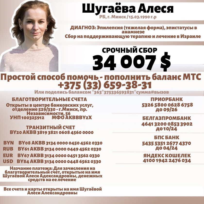 Благотворительные счета открыты на имя Шугаёвой Алеси Александровны