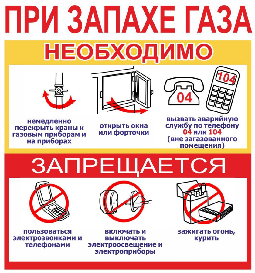 При появлении в помещении запаха газа следует немедленно прекратить пользование газоиспользующим оборудованием (перекрыть кран перед газоиспользующим оборудованием и на нем), открыть окна и двери для проветривания помещения, незамедлительно сообщить об этом в аварийную газовую службу по телефону 104.