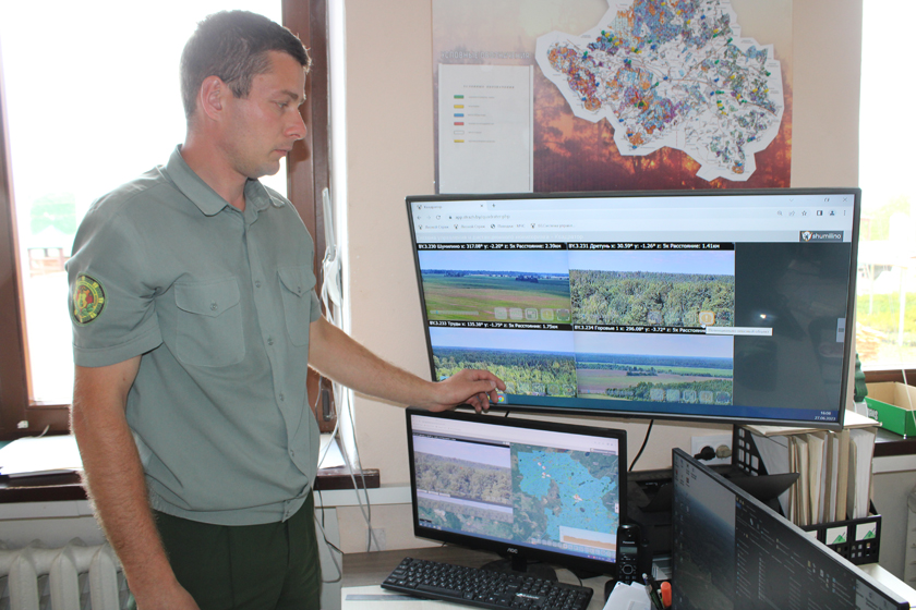 – Сістэма «Лясны Страж» у Шумілінскім лясгасе працуе з красавіка мінулага года, – расказвае інжынер па ахове і абароне лесу лясгаса Антон Шабанаў. – У раёне за сітуацыяй у лясах назіраюць пяць камер, большасць з іх размешчана на вышках сотавай сувязі. Радыус ахопу адной камеры складае 35 км. Уся інфармацыя з камер анлайн выво-дзіцца на камп’ютар. Пры з’яўленні «падазронай» кропкі падаецца гукавы сігнал.