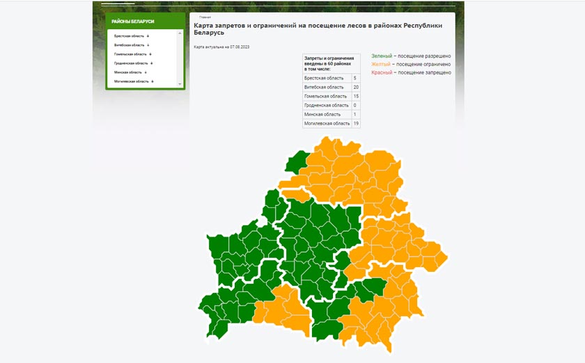 В Минской области ограничен к посещению один район — Мядельский. В Могилевской области ограничены 19 районов — все, кроме Осиповичского и Глусского. В Витебской области ограничено 20 районов — это также все районы области, кроме Браславского.