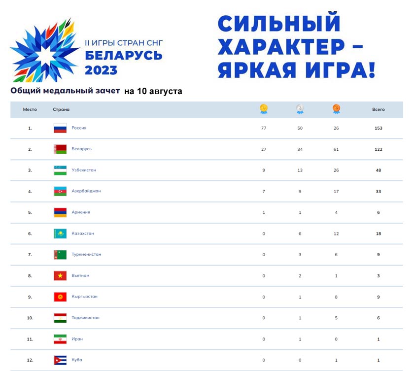 II Игры стран СНГ: медальный зачёт на 10 августа
