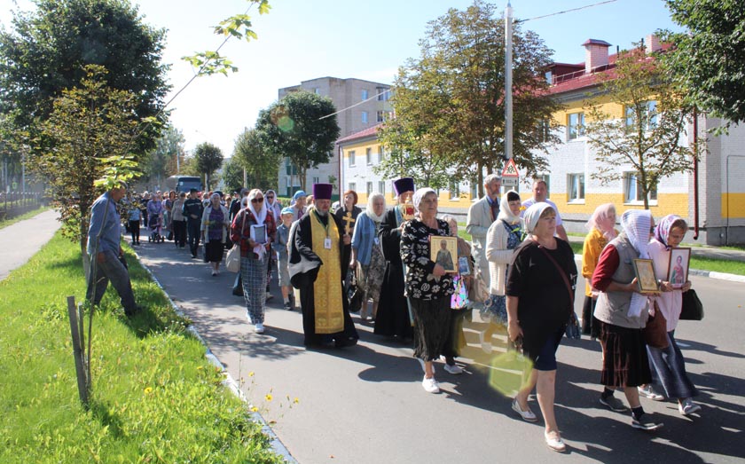 У раённым цэнтры хрэсны ход з цудатворнай Загор’е-Сталовіцкай іконай Прасвятой Багародзіцы і Жыватворным агнём ад Труны Гасподняй прайшоў па вуліцы Кароткіна да Свята-Мікалаеўскай царквы.