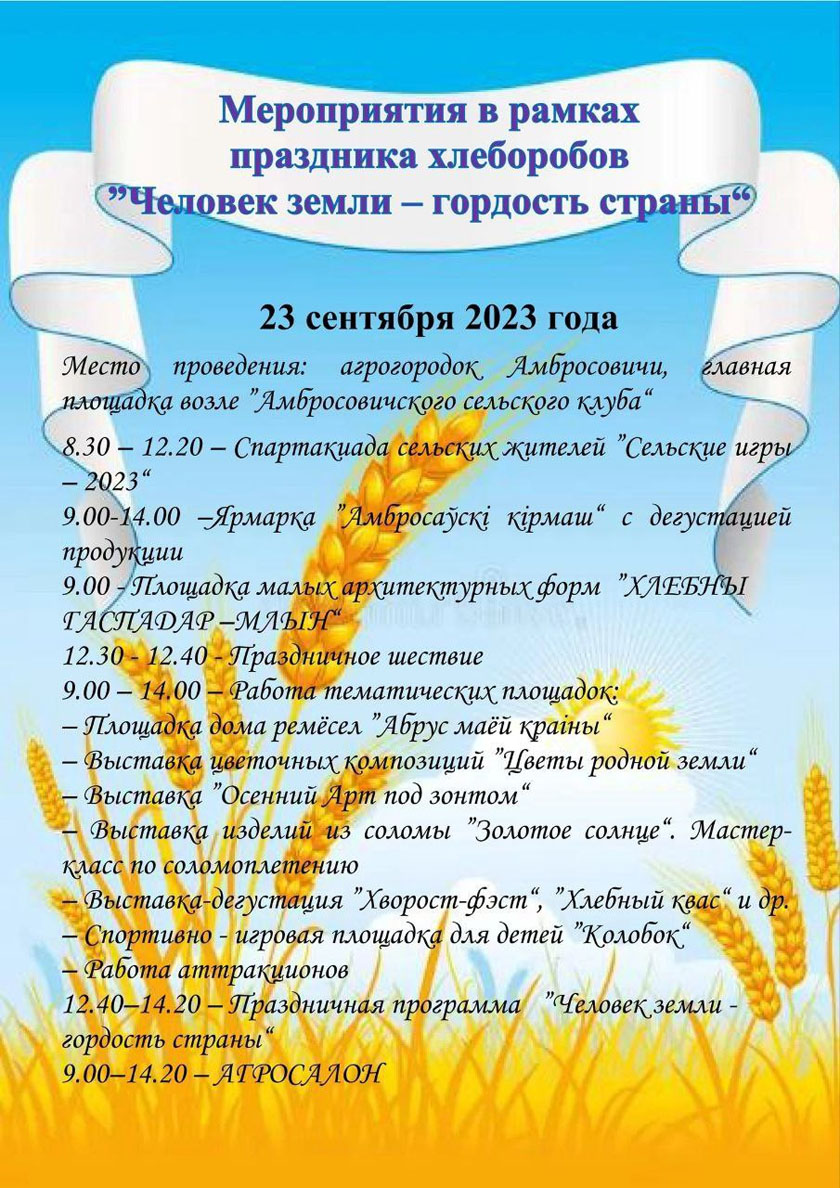 Праздник хлеборобов Шумилинщины «Человек земли — гордость страны» состоится 23 сентября в агрогородке Амбросовичи