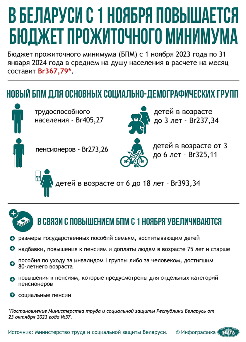 Постановлением Министерства труда и социальной защиты Республики Беларусь от 23 октября 2023 года № 37 на период с 1 ноября 2023 года по 31 января 2024 года утверждены новые размеры бюджета прожиточного минимума (БПМ) в среднем на душу населения и по основным социально-демографическим группам.
