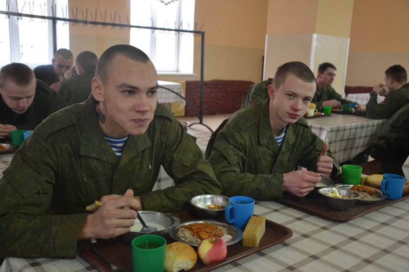 Хацелася карэспандэнту для поўнай карціны пранікнуць і на армейскую кухню, даведацца, чым кормяць дэсантнікаў. Як аказалася, кормяць добра. Да прыкладу, у дзень нашага прыезду на сняданак была прасяная каша з курыцай, на абед – грэчка са свінінай, на вячэру – макарона са скумбрыяй. Кампоты, чай і булачкі з маслам. «Кормяць тут выдатна. Пастаянна мяса і рыба. Першыя тыдні нават не з’ядаў усё, што давалі», – гэта словы Максіма Голубева.