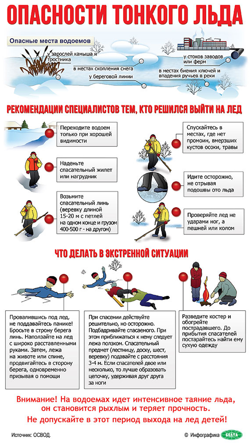 – При движении по ледовому покрытию следует быть осторожным, внимательно следить за его поверхностью, обходить опасные и подозрительные места (впадение ручьев, выход грунтовых вод и родников, сброс промышленных и сточных вод, вмерзшие кусты осоки, травы).