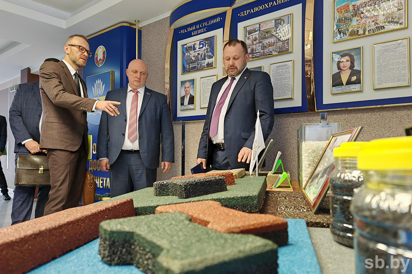 – Этот комплекс самый значимый и самый дорогостоящий на нашем предприятии, состоит из двух линий оборудования. Планируем здесь изготавливать резиновые плитку, брусчатку, бордюр разных размеров, форм и цветов. Такие изделия получаются прочные, травмобезопасные, морозоустойчивые, не выгорают на солнце, с долгим сроком службы. Использовать их можно как на улице, так и внутри помещений, – рассказал директор УП «Биомехзавод бытовых вторресурсов» Сергей Велюго.