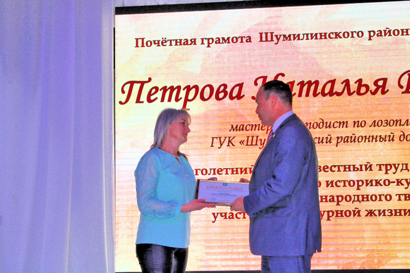 Адбылося ўзнагароджанне лепшых ра-ботнікаў галіны. Мікалай Будневіч уручыў Ганаровую грамату раённага Савета дэпутатаў метадысту па лазапляценні Шумілінскага раённага Дома рамёстваў Наталлі Пятровай – за шматгадовую добрасумлен-ную працу, захаванне нацыянальнай гісторыка-культурнай спадчыны, асабісты ўклад у развіццё народнай творчасці і актыўны ўдзел у культурным жыцці грамадства. Падзяка старшыні райвыканкама аб’яўлена метадысту па ганчарстве Аляксандру Любімаву – за захаванне і аўтарскае развіццё ганчарнага рамяства, папулярызацыю нацыянальнай культурна-гістарычнай спадчыны, высокія творчыя дасягненні, актыўны ўдзел у мерапрыемствах і міжнароднае супрацоўніцтва.