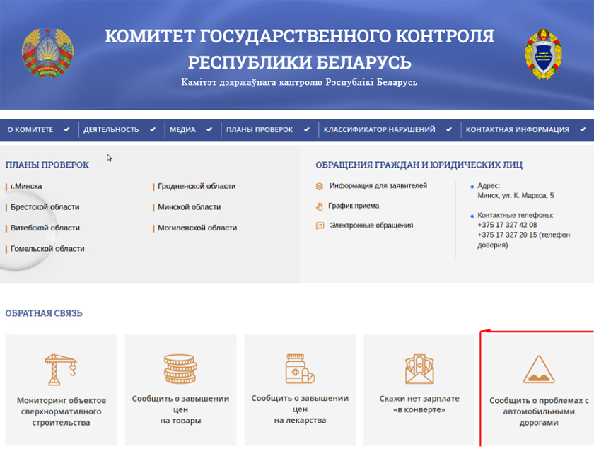 Сообщить о недостатках на трассах и автодорогах общего пользования (речь идет об автотрассах вне населенных пунктов) можно через онлайн-панель «Сообщить о проблемах с автомобильными дорогами», которая размещена на интернет-сайте Комитета госконтроля. Информация будет приниматься в течение апреля т.г.