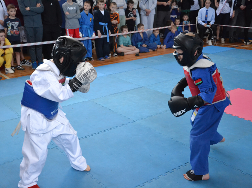 Першымі на дыван выйшлі самыя юныя спартсмены. Лёгкія (вага да 20 кг), пальчаткі амаль у іх рост, на паядынак іх выводзяць за руку старэйшыя сябры. Затое сам паядынак – безліч удараў, маса эмоцый.