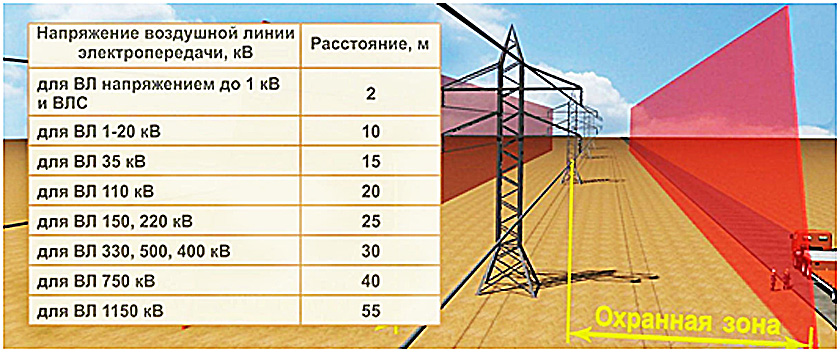 Для предотвращения несчастных случаев и обеспечения сохранности воздушных линий электропередачи (ЛЭП), в процессе их эксплуатации, вдоль каждой линии установлена охранная зона. Для ЛЭП – это земельный участок и воздушное пространство, по обе стороны линии от крайних проводов на расстоянии от 2 до 30 метров в зависимости от напряжения линии.