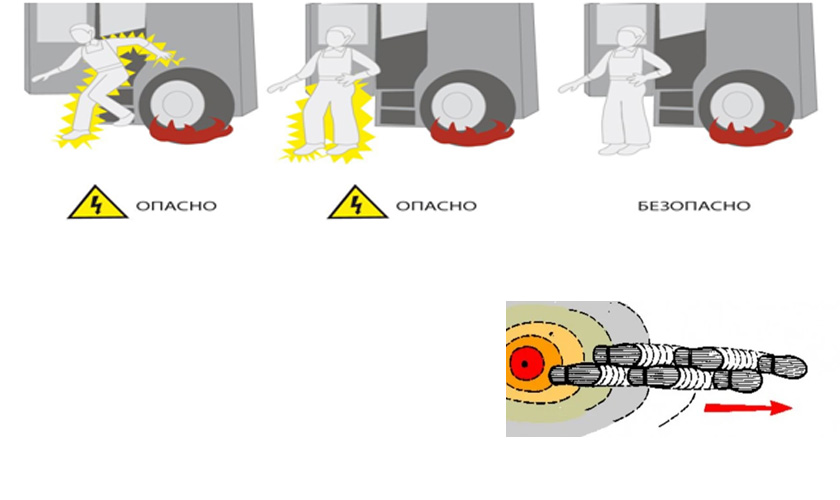 поражение электрическим током может произойти не только в результате прикосновения человека или механизма к токоведущим частям (проводам), но и вследствие приближения к ним на недопустимое расстояние. При падении провода на землю опасность поражения может возникнуть и в зоне растекания электрического тока в результате воздействия шагового напряжения;