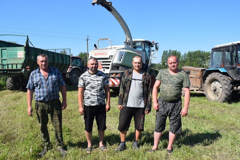 Тым часам пад’ехаў Уладзімір Аляксандравіч: «Нарыхтоўка кармоў – гэта калектыўная работа. Тут, як кажуць, адзін у полі не воін. Таму ў маіх здробненых то-ах – заслуга і ўклад кожнага. Таму і фатаграфавацца калі і буду, то толькі разам. Мы адна каманда, і робім адну важную справу».