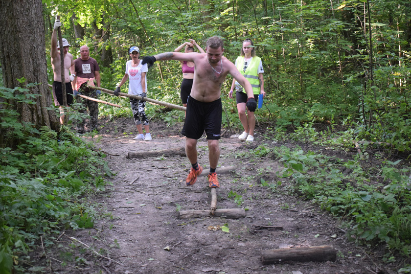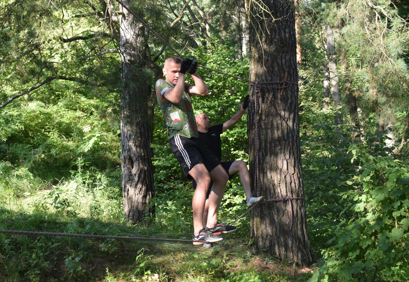 Прызнаюся: на турзлётах не была з часоў студэнцтва. Таму для мяне было цікавым усё, асабліва паласа перашкод. Калі ў тэхніцы веласіпеднага турызму яшчэ змагла неяк праехаць на самы мінімальны бал, то ў горна-пешаходным турызме было вельмі складана. Наогул праграма першага дня была вельмі насычанай, эмацыянальнай і яркай. Пасля данбайскага кертнболу (валейбол з закрытай сеткай) каманды адправіліся на горна-пешаходныя іспыты па лясным масіве. Да першага выпрабавання, дзе трэба было прайсці па ніжняй вяроўцы марудным крокам, трымаючыся за верхнюю, дабегла хутка. І выпрабаванне (калі не ўлічваць час) падалося няцяжкім. Вяроўка прагібаецца, але прайсці можна. Тое самае і на “маятніку” – схапіўся за канат і раскачаўся. Вядома, не як прафесіяналы, але ўсё ж. Ад гэтых выпрабаванняў трэба было хутчэй бегчы да наступных. Вось тут ужо і адстала… І калі падбегла да каната, трымаючыся за які трэба было падняцца на горку, каманда, за якой спяшалася, была ўжо на вяршыні. Падымацца па канаце здалося цяжка, тым больш баялася ўпусціць фотаапарат, таму ўгору лепш звычайным крокам. Тым часам каманда наперадзе прайшла выпрабаванні па бервяну і адправілася на далейшыя іспыты. Нялёгкая гэта паласа перашкод, тым больш у такую спякоту! Усё, з мяне хопіць! Усё-такі лепш фотарэпартажам займацца. Разам з тым каманды справіліся. Некаторыя нават на “выдатна”. Рэспект і павага іх вынослівасці, сіле духу і арганізаванасці!