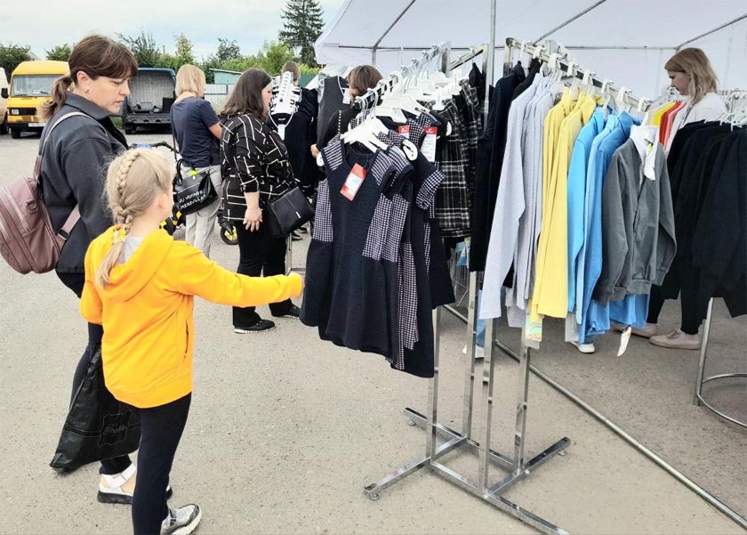 Тавары на школьны базар прывезла індывідуальны прадпрымальнік з Шуміліна Алена Пракопчык. У яе можна было набыць кашулі для хлопчыкаў розных колераў па 35-40 рублёў, штаны па 35-50 рублёў, сарафаны і спадніцы па 20-25 рублёў. «Мне мама купіла дзве кашулі: цёмную – на кожны дзень, а светлую – для сцэны, я часта на святах чытаю вершы», – расказаў шасцікласнік Багдан Гарлачоў.