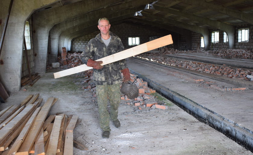 Разам з будаўнікамі заходзім унутр памяшкання. Сцены-перагародкі, якія былі тут узведзены, разабраны. Уся падлога засыпана бітай чырвонай цэглай. «Цэгла нам спатрэбіцца, калі будзем заліваць падлогу, каб была роўнай, – зазначылі будаўнікі».
