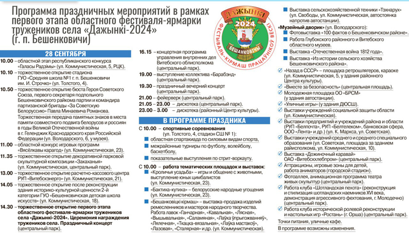 Программа праздничных мероприятий в рамках первого этапа областного фестиваля-ярмарки тружеников села «Дажынкі‑2024» в г. п. Бешенковичи