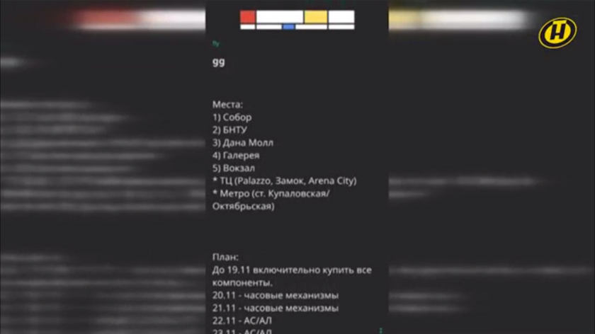 В телеэфире показали скриншот с местами предполагаемых взрывов: Свято-Духов кафедральный собор, БНТУ, железнодорожный вокзал и торговые центры «Дана Молл» и «Галерея», как варианты — торговые центры Palazzo, «Замок» и «Арена Сити» и переход от станции метро «Купаловская» до ст. «Октябрьская». Далее размещается план о покупке всех компонентов, в том числе часовых механизмов.