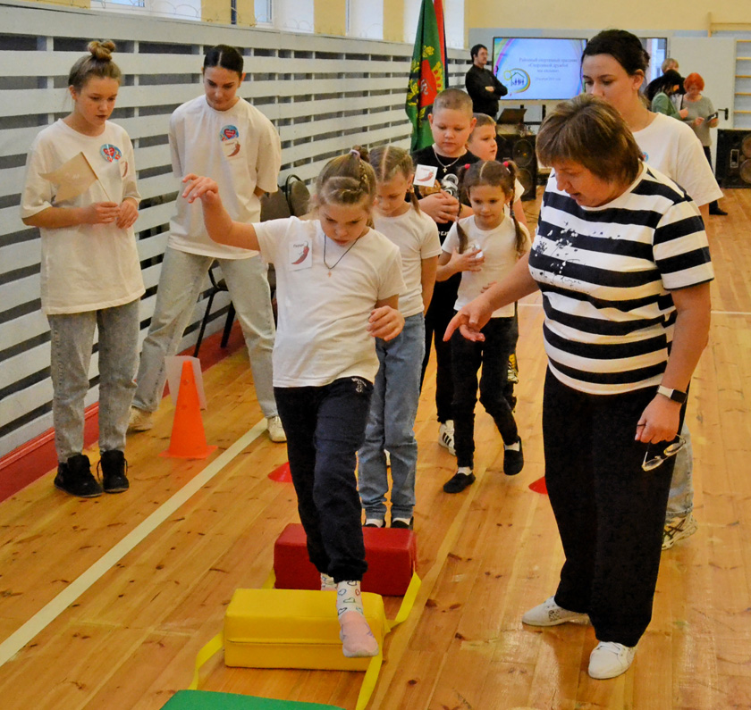 А ў перапынках паміж этапамі спартландыі дзеці ўдзельнічалі ў актыўным флэшмобе, які арганізаваў танцавальны калектыў «Вясёлка» раённага цэнтра дзяцей і моладзі.
