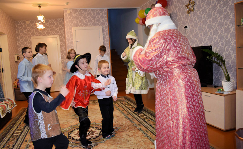 Разам з галоўнымі героямі свята завітала ў вялікую сям’ю, дзе зараз выхоўваецца сямёра дзетак ад 6 да 13 год, намеснік старшыні райвыканкама Ірына Шалахава і пажадала ўсім здароўя, усмешак і святочнага настрою. А пасля хлопчыкі і дзяўчынкі разам з дарослымі вадзілі карагоды, спявалі, танцавалі, расказвалі Дзеду Марозу і Снягурцы вершы, весяліліся падчас конкурсна-гульнявай праграмы, якую падрыхтавалі работнікі раённага цэнтра дзяцей і моладзі.