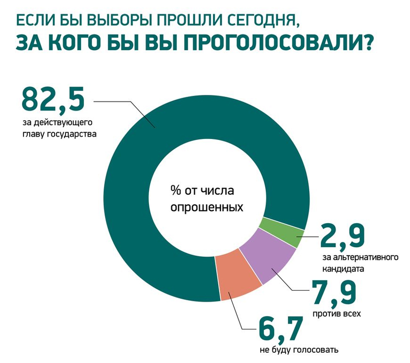 Респондентам предлагалось ответить на вопрос: «Если бы выборы прошли сегодня, за кого бы вы проголосовали?». «За действующего главу государства» — так ответили 82,5% опрошенных, «за альтернативного кандидата» — 2,9%, «против всех» — 7,9%, «не буду голосовать» — 6,7%.
