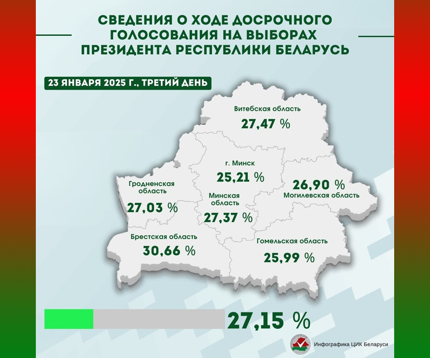 За три дня в досрочном голосовании на выборах Президента Республики Беларусь приняло участие 27,15% от общего числа граждан, включенных в списки для голосования. Об этом сообщили в ЦИК.