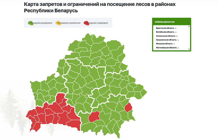 Оперативно отслеживать данные о введении мер ограничительного характера можно по размещенной на официальном сайте Минлесхоза карте запретов и ограничений на посещение лесов. Также информацию можно уточнить в местных райисполкомах и лесохозяйственных учреждениях. Интерактивная карта обновляется в онлайн-режиме, поэтому перед посещением лесных массивов стоит ознакомиться с актуальной ситуацией.