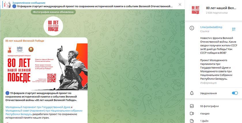 Маладзёжны парламент пры Дзяржаўнай Думе сумесна з Маладзёжным парламентам пры Нацыянальным сходзе Рэспублікі Беларусь далі старт праекту «80 гадоў нашай Вялікай Перамозе». Міжнародны праект уяўляе сабой Tеlеgram-канал (t.me/pobeda80mp), у якім усе жадаючыя змогуць убачыць архіўныя зводкі з фронту Вялікай Айчыннай вайны. У ім публікуюцца навіны мінулых дзён, лісты ўдзельнікаў Вялікай Айчыннай вайны і іншыя гістарычныя даведкі, якія захаваліся ў Расійскай Федэрацыі і Рэспубліцы Беларусь.