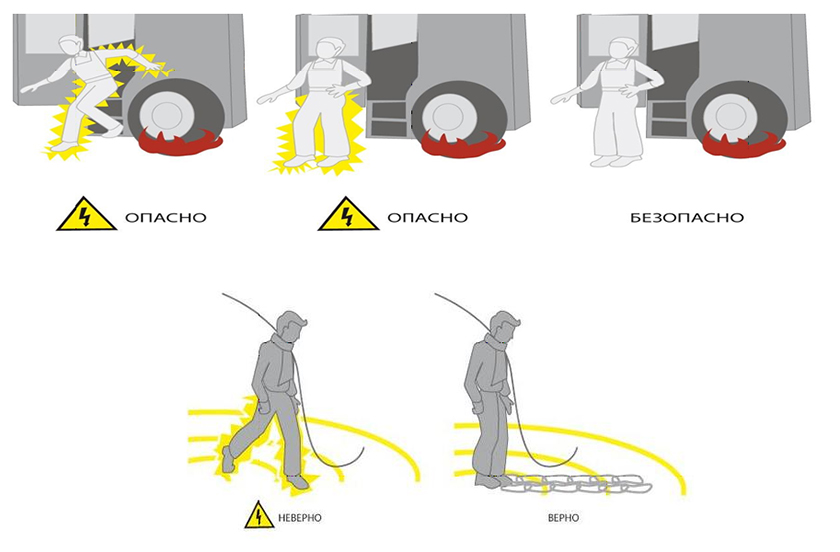 При загорании агрегата в результате падения провода или возникновения электрического разряда необходимо немедленно покинуть агрегат, но так, чтобы не было одновременного соприкосновения человека с машиной и землей, т.е. спрыгнуть на землю на обе сомкнутые ноги, не держась за машину. Удаляться от машины до снятия напряжения можно только мелкими шагами, не отрывая ног одну от другой и от земли.